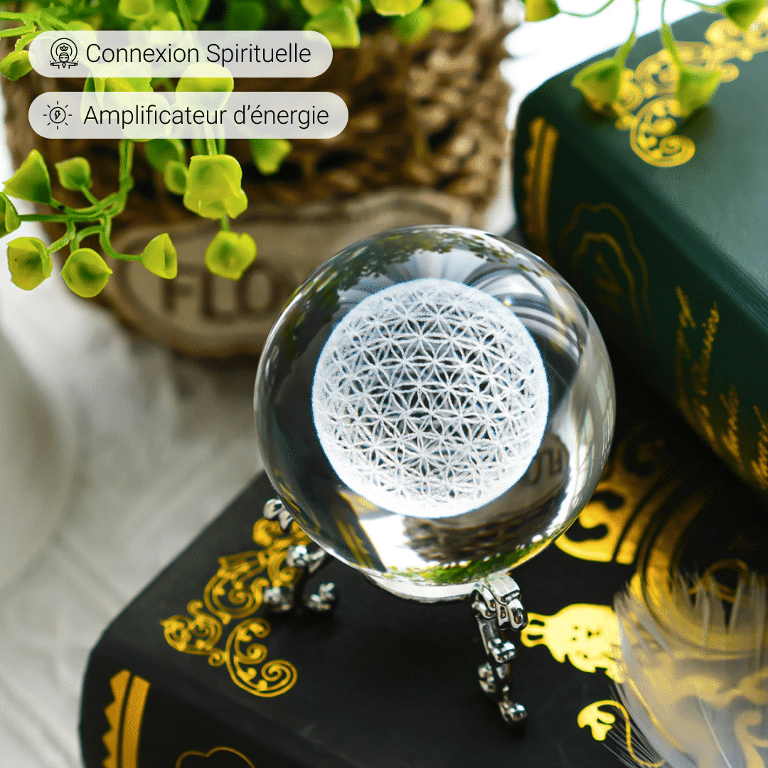The crystal, known for its clarity and purity, is often utilized in spiritual practices to amplify energy and focus. The Flower of Life inside serves as a constant reminder that life is a tapestry of connections and circular energy.