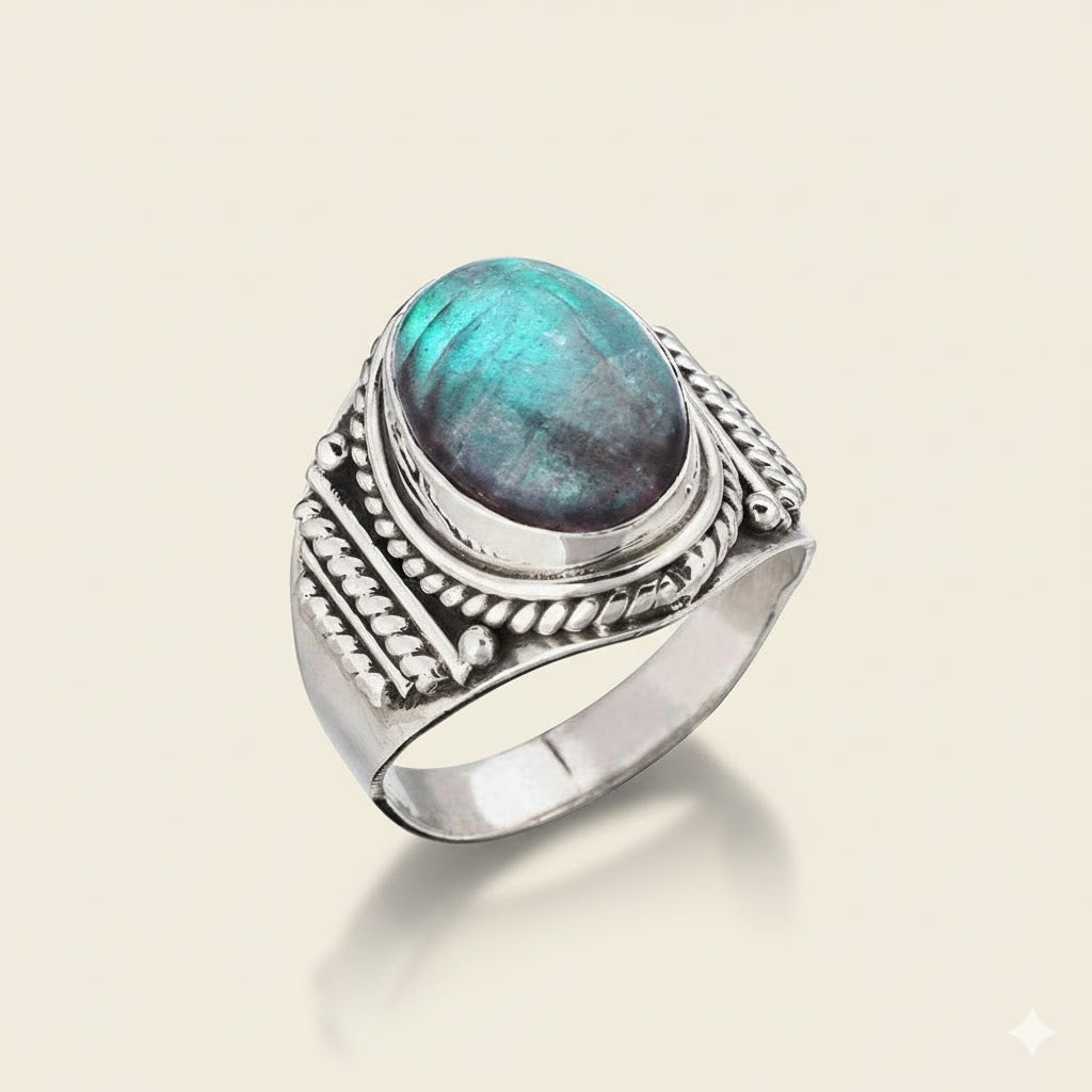 Find your voice by connecting with the throat chakra. Labradorite energies encourage us to express ourselves by speaking our truth. Discover your unique melody through self-expression with this special Aria ring.